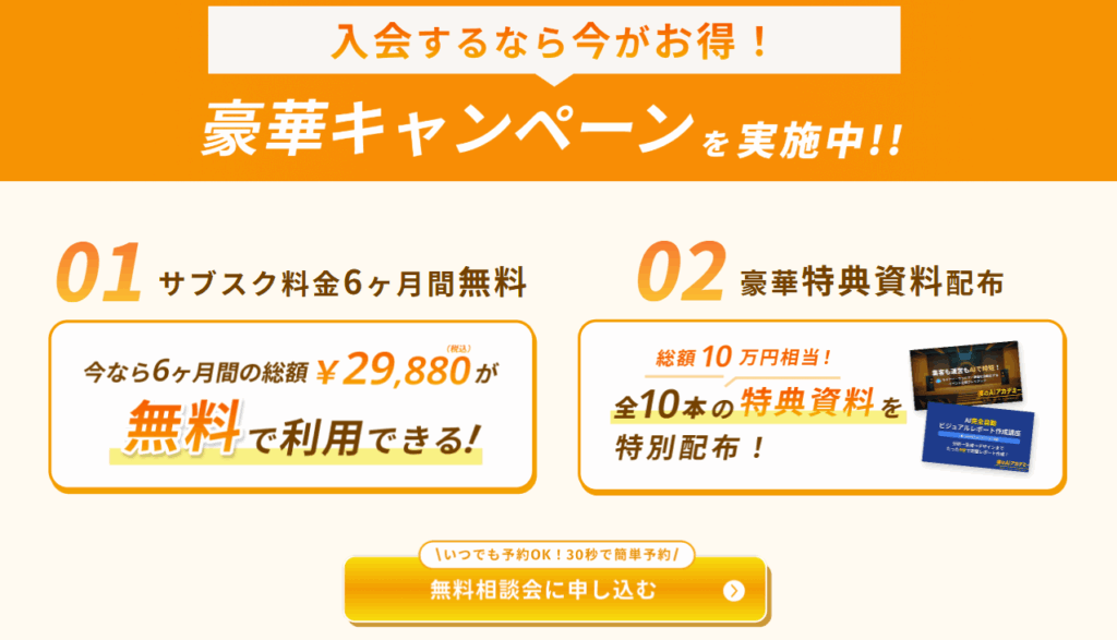 開校記念として「サブスク料金6か月無料キャンペーン」が実施されていました。時期によって内容が変わる可能性があるため、最新情報は必ず公式サイトで確認してください。