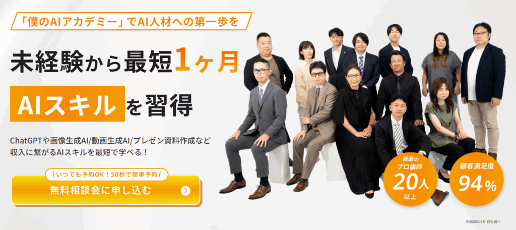 僕のAIアカデミーは、未経験から最短1か月でAIスキルを習得できる実践型オンラインスクール。