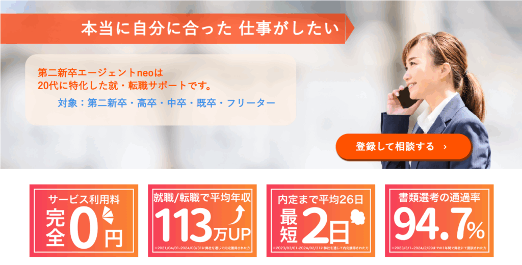 第二新卒エージェントneoは、18歳〜28歳を中心に、フリーター・既卒・中退・短期離職など幅広い経歴の方に向けて、完全無料で就職・転職サポートを提供しているエージェントです。
