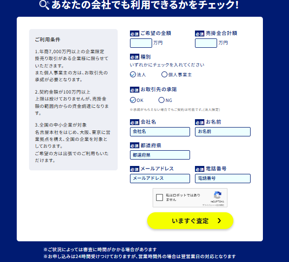 | 法人の利用条件 | 年商7,000万円以上(掛売り取引がある企業) |