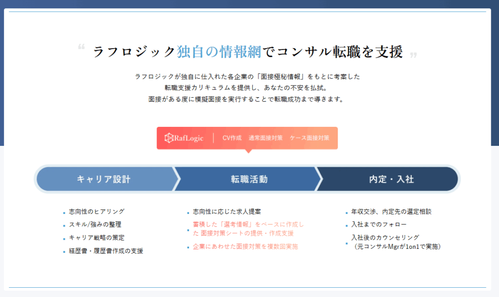 ラフロジックは、デロイト・PwCをはじめとする大手コンサル出身者が直接サポートする、コンサル業界特化型の転職エージェントです。